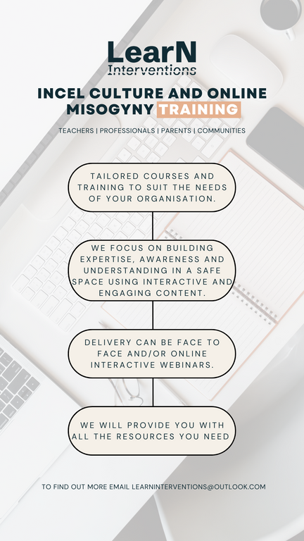 These can be 1-, 2- or 3-hour (half day) training sessions run either face to face or online to increase awareness and understanding of Incels as well as being able to identify, prevent & challenge Incel inspired harmful behaviours.